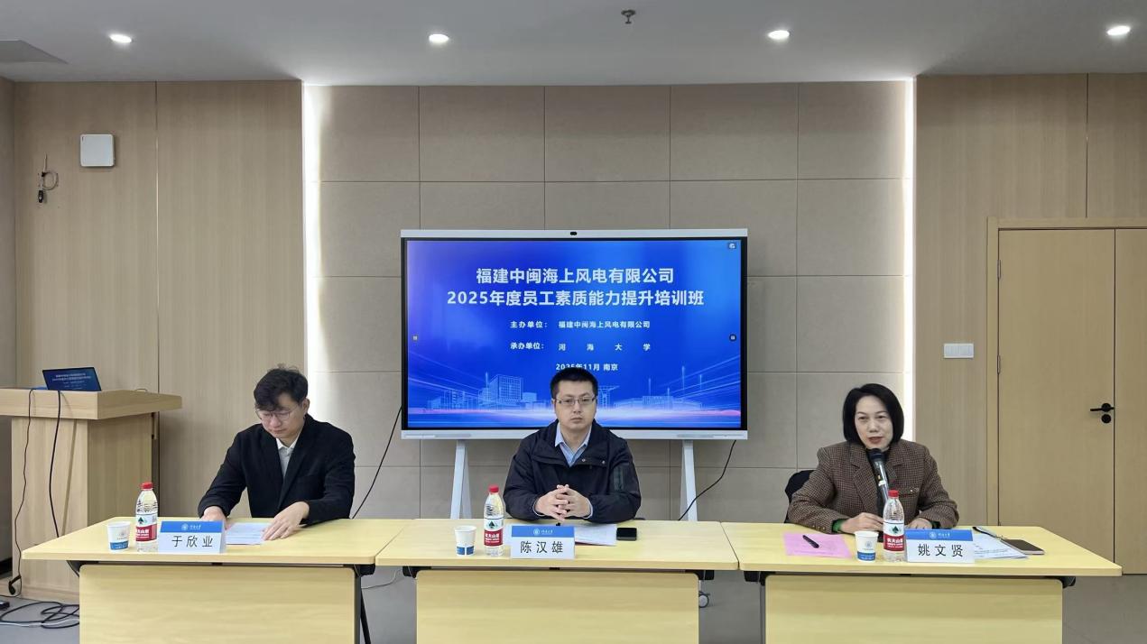 11月10日,由福建中闽海上风电有限公司主办、河海大学承办的“2025年度员工素质能力提升培训班”在我校顺利开班。本次培训紧密围绕国家“双碳”战略与能源转型大局,聚焦海上风电产业高质量发展对人才能力提出的新要求,致力于打造一支高素质、专业化的干部人才队伍,为企业持续创新与绿色发展注入新动能。