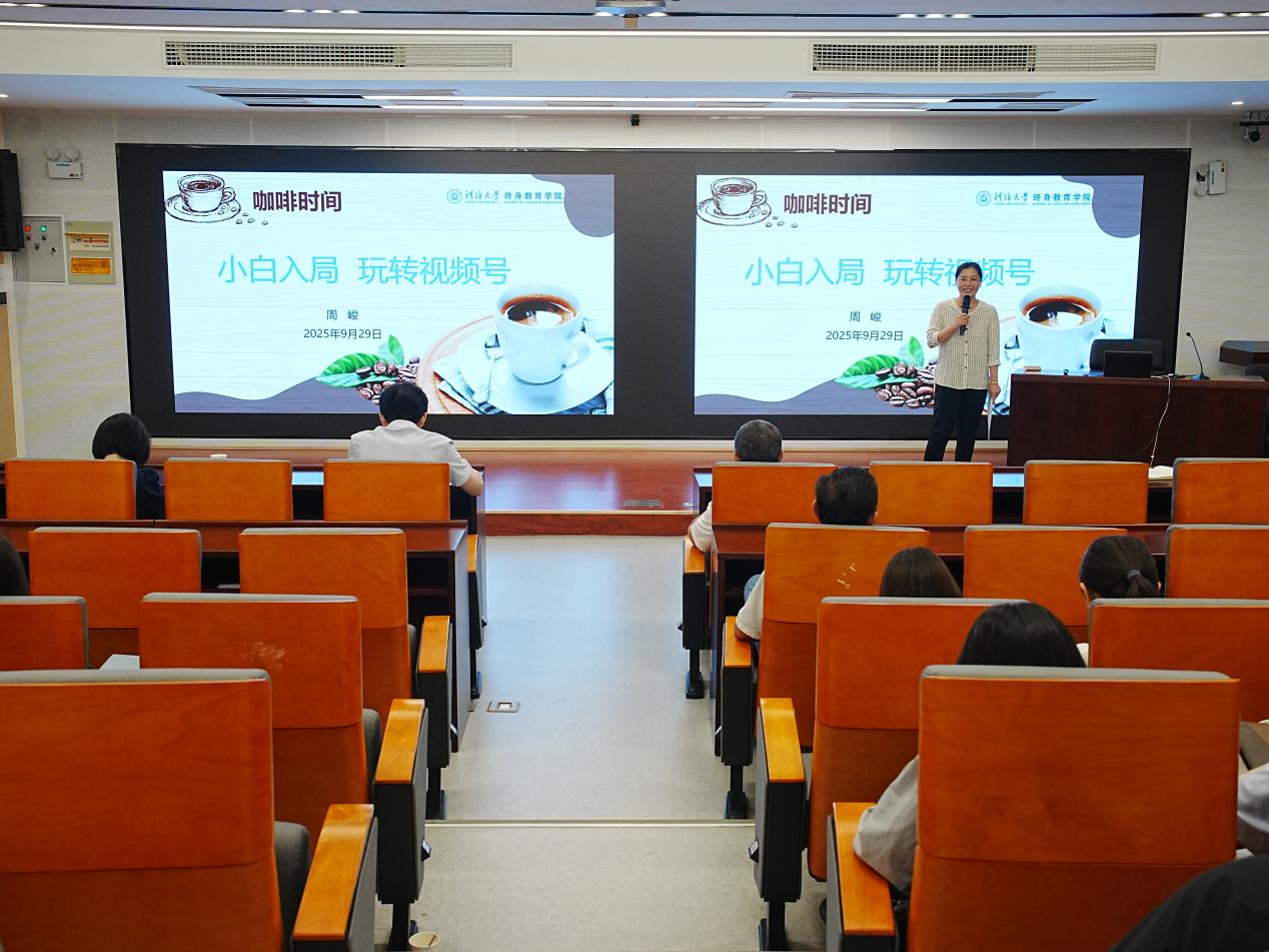 9月29日下午,终身教育学院附楼401报告厅内,咖啡醇香与欢乐氛围交织,由学院分工会精心组织的本年度第五期“咖啡时间”活动在此举行。本次活动以“小白入局—玩转视频号”为主题,邀请学院企业教育培训中心主任周峻担任分享嘉宾,全院教职工积极参与。